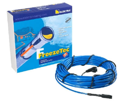 ELEKTRA grijaći kabel s ugradenim termostatomELEKRA FreezeTec™ sustav štiti cijevi, cjevovode i ventile od smrzavanja u ledenim zimskim danima! PrimjenaELEKRA FreezeTec je namijenjen za zaštitu cijevi i ventila izloženim mogućim oštećenjima uzrokovanim niskim temperaturama. Sustav se može koristiti kada su zadovoljeni slijedeći uvjeti: Karakteristike i prednostiELEKRA FreezeTec se sastoji od zagrijavanja kabela s ugrađenim termostatom te radi automatski, nema potrebe za uobičajeno potrebnim sustavom regulacije grijaćih kabela. Sustav ne traži regulaciju, a instalacija sustava je brza i jednostavna. Tehničke specifikacije:termostat uključuje na temperaturi +3°C; Vrste kabelaELEKRA FreezeTec kablovi su dostupni kao gotovi setovi s ugrađenim termostatom i trožilnim napojnim kabelom duljine 1,5 m. InstalacijaPrije postavljanja kabela potrebno je izmjeriti duljinu cijevi koju želimo grijati. Osim duljine cijevi, kako bismo odabrali koeficijent i potrebnu duljinu FreezeTec grijaćeg kabela, za zaštitu cijevi potrebno je znatti i promjer cijevi, debljinu izolacije te minimalnu temperaturu okoline. Koeficijent je u instalacijskom priručniku.