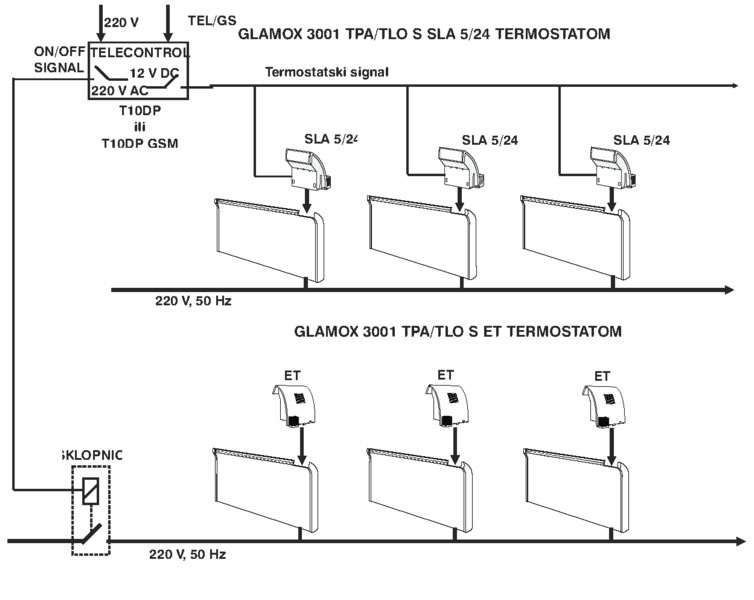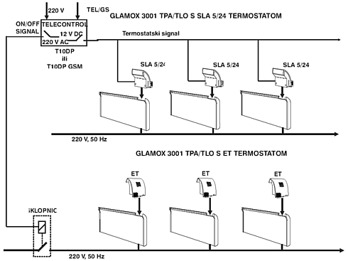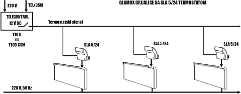 Telefonski upravljane dvije grupe grijalica GLAMOX 3001 sa ET termostatima i slijednim modulima SLA 5/24